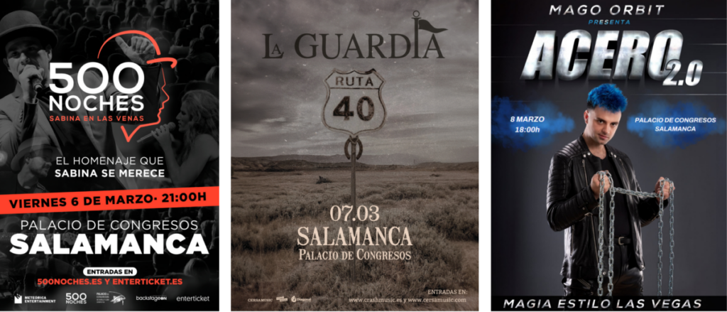 El Palacio de Congresos de Salamanca acoge entre el viernes 6 y el domingo 8 de marzo tres espectáculos de música y magia: un tributo a Joaquín Sabina a cargo de 500 Noches Banda, el concierto de La Guardia en el marco de su gira del 40 aniversario y el show de magia familiar ACERO 2.0 del Mago Orbit.