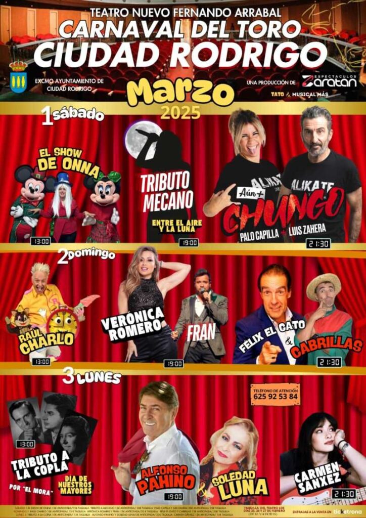 El Teatro Nuevo «Fernando Arrabal» de Ciudad Rodrigo ha programado nueve espectáculos durante el Carnaval del Toro 2025, que se celebrarán del 1 al 3 de marzo. La programación, organizada por Espectáculos Zaratán y Tato & Musical Más, con la colaboración del Ayuntamiento, incluye actuaciones musicales, humor y espectáculos infantiles.