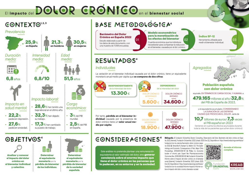 Un nuevo estudio presentado por la Fundación Grünenthal revela que el impacto del dolor crónico intenso en el bienestar individual equivale a 47.900 euros anuales por persona. La investigación «El impacto del dolor crónico en el bienestar social» calcula el equivalente monetario que compensaría la reducción de calidad de vida en pacientes con esta condición.
