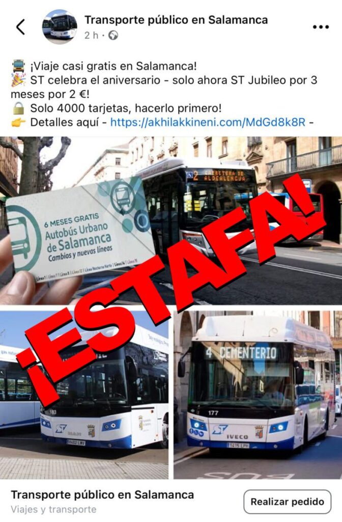 La Policía Local de Salamanca alerta de una estafa en redes sociales relacionada con el transporte urbano por autobús. Una cuenta en Facebook que opera bajo el nombre ‘Transporte público en Salamanca’ ofrece bonos gratuitos de seis meses para viajar en el autobús urbano de la ciudad.