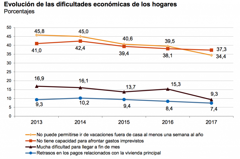 El 9,3% de los hogares españoles manifestó llegar a fin de mes con “mucha dificultad” en 2017. Este porcentaje fue 6,0 puntos inferior al registrado el año anterior.